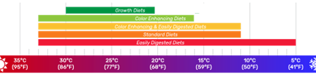 | 13-17°C | Foder ikke mere end 2 gange dagligt. Ved denne temperatur bør dine fisk svømme aktivt rundt og søge føde. Jeg anbefaler Nutramare Sensetive og Saki Hikari Multi season og Saki Hikari Balance |