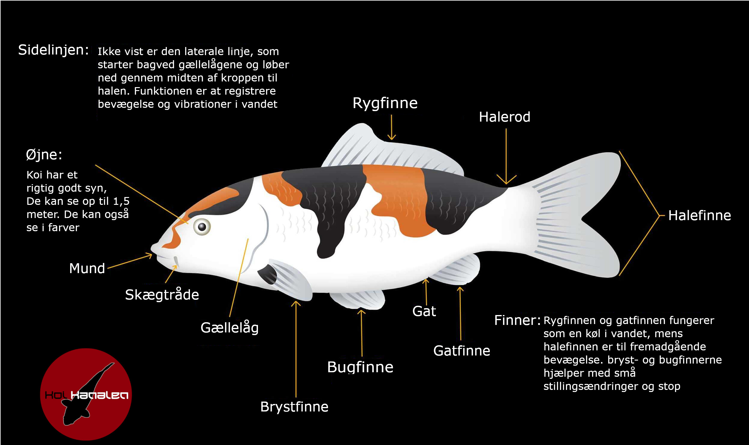 Den laterale linje løber langs siden af Koi, cirka halvvejs ned ad fisken. Huller i skællerne forbinder til en kanal under overfladen, der indeholder neuromastceller. Enhver bevægelse af vand, der rører ved fiskens sider, får slimet i kanalen til at vibrere.